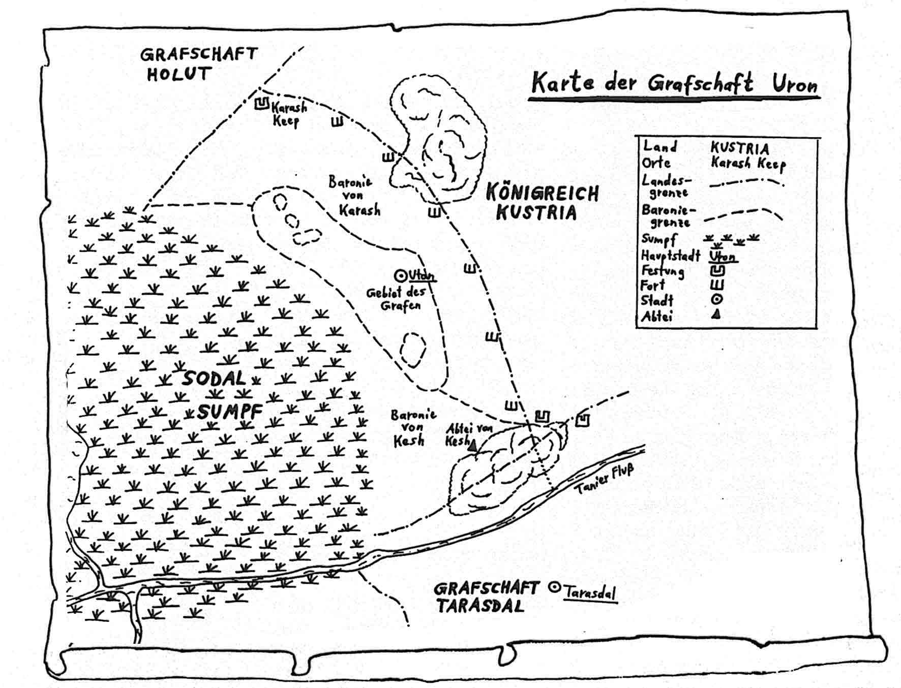Grenzecke zu Holut und Kustria, bei der sich die größere Siedlung Karash gebildet hat, in der die besten Handwerkserzeugnisse Urons hergestellt werden. Eine weitere Siedlung namens Kesh um die gleichnamige Abtei am