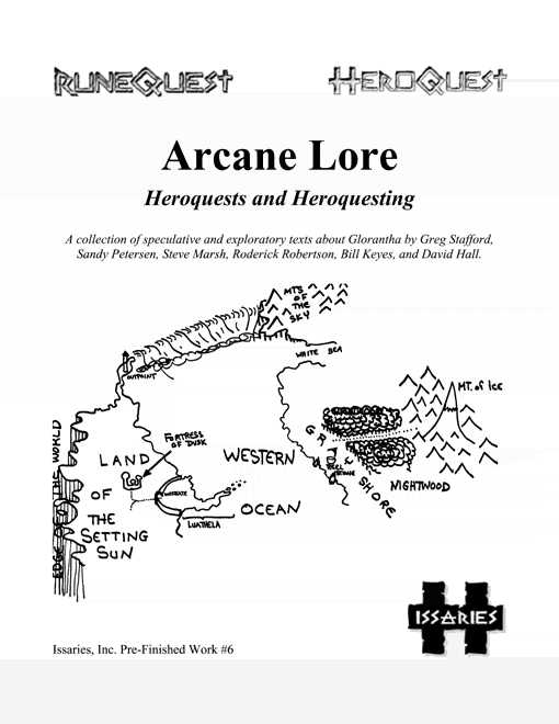 Das "Work in Progress" # 6 ist, wie schon seine Vorgänger, ein photokopierter Band mit Klemmbindung und mit ledigleich der Skizze einer Landkarte auf einem roten Pappcover. Um es vorwegzunehmen: Die neueren Works in Progress, "Missing Lands" und "Revealed Mythologies", sind recht hilfreiche Texte über noch nicht so genau beleuchtete Gegenden Gloranthas bzw. Gewähren einen tieferen, aber auch Einsteigerfreundlichen, Einblick in die Mythologien der verschiedenen Kulturen der Welt. Nun kommt mit "Arcane Lore" eine Sammlung von Gedanken, Fakten, Ideen und Geschichtlichen Daten über das Heroquesten, so wie Beschreibungen einiger Heldenquesten selbst. Es ist schwierig sich das Buch von vorne bis hinten durchzulesen, aber es gibt dort Elemente die SO interessant sind, dass man gar nicht erwarten kann MEHR zu erfahren… und da das entgültige HQ Buch über das Heroquesten wohl noch auf sich warten lassen wird muss man sich mit Arcane Lore zufrieden geben und versuchen die sich zum Teil wiedersprüchlichen Dinge herauszufiltern. Nun aber Punkt für Punkt: Das Buch beginnt mit "Heroquesting". Was ist das? Wie wird es erklärt? Wo kommt es her? Wie geht man damit um? "Gods and Mortals" erklärt Helden, Demigods, Götter, Große Götter etc. und gibt ihnen Spielwerte (bzw. Zeigt die Spanne auf in der sich eine typische Wesenheit bewegt). In "The Worlds" wird dann auf die Anderswelten (Götter, Geister, Zauberer) eingegangen und die Heldenebenen und die Sonderstellungen (Hölle). "The Mythic Ages" erklärt uns WAS die vergangenen Zeitalter (vor Begin der Zeit) waren, und wie sie ausssahen und was dort geschah. Hier und da ist eine Karte beigefügt. "The Hill of Gold" ist Yelmalios-Heldenqueste in der er seine Feuerkräfte verliert. "The Lightbringer´s Quest" berichten (mit immer noch großen Lücken) so Detailreich wie bisher noch nie von DER Queste. Eine Reihe weiterer (zum Teil zusammenhängender oder auch obscurer Questen machen die letzten 30 Seiten aus. Mal in benutzbarem Format präsentiert, mal nur als Erzählung oder Spekulation werden Questen vorgestellt. Letzten Endes möchte ich jedem der die Welt Glorantha liebt dieses Buch wärmstens ans Herz legen und Gloranthaphilen sagen das sie es haben müssen!