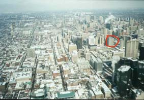 Toronto vom CN Tower aus gesehen (der rote Kreis markiert das Colony Hotel)